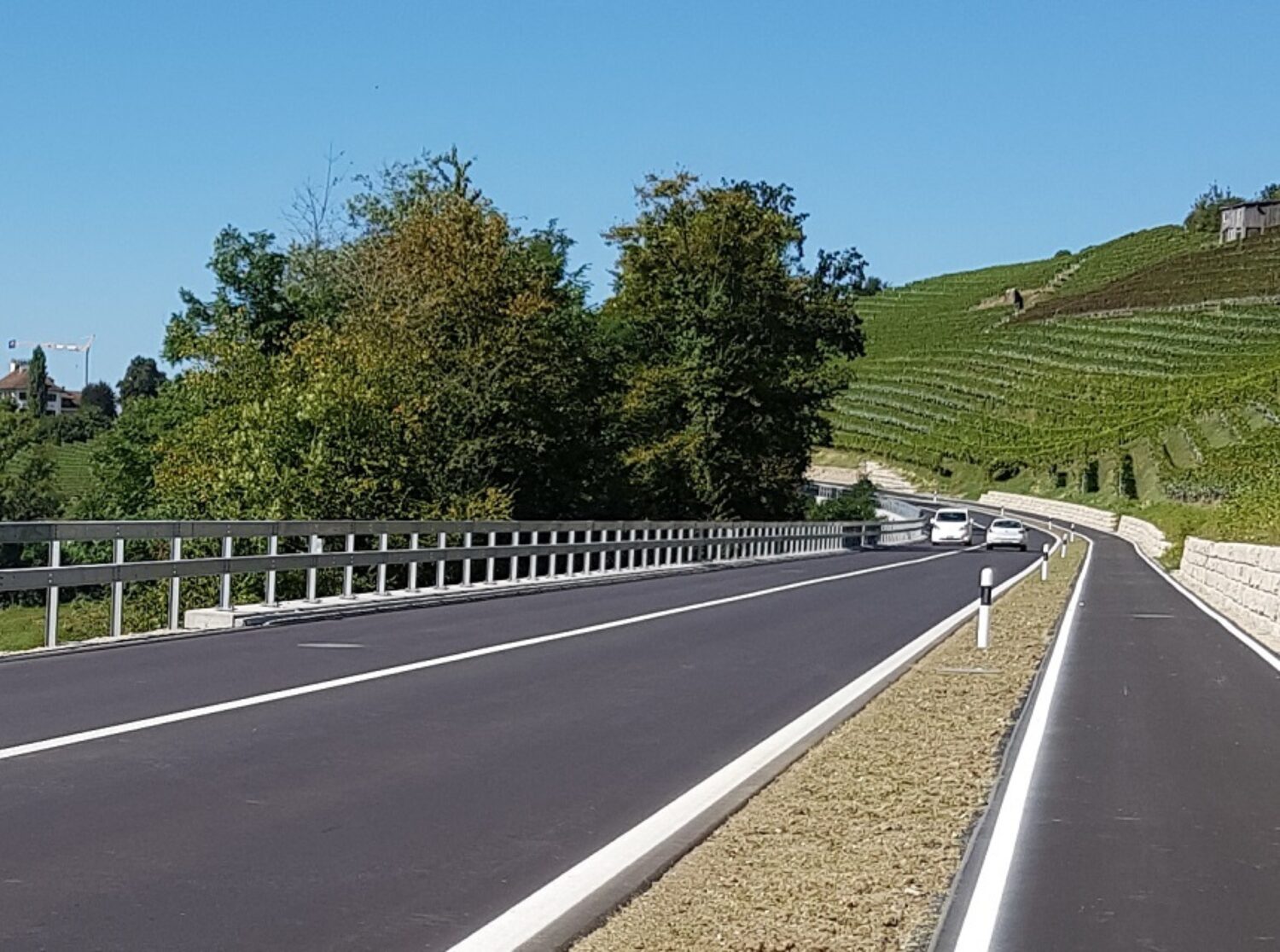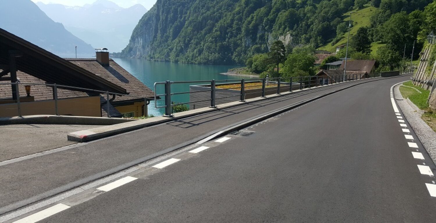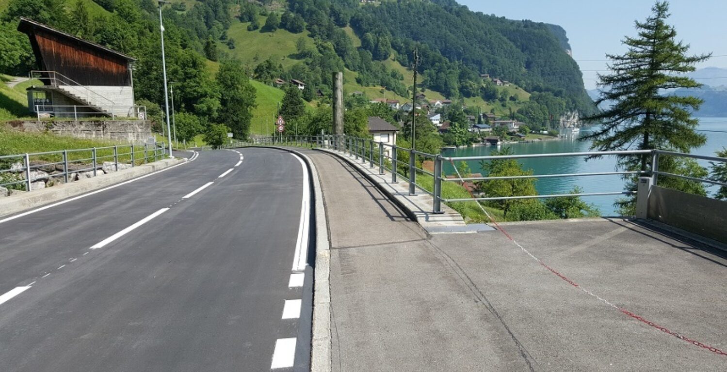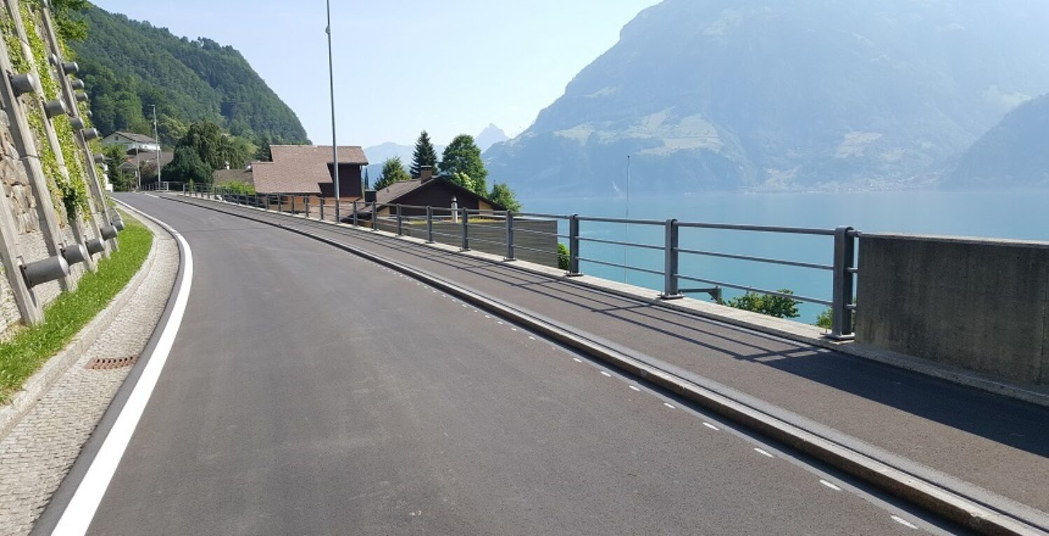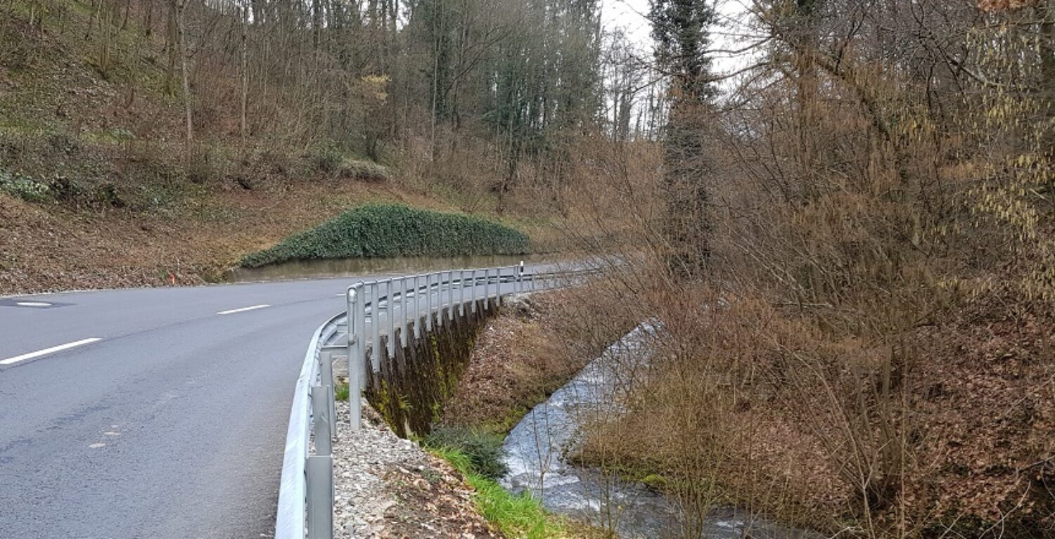 Seit der Ausarbeitung des Auflageprojektes 2010 hatten sich die Parameter der passiven Sicherheit wesentlich verändert. Beispielsweise überschritt der DTV in dieser Zeit die Grenze von 12‘000 Fz/d. Im gleichen Zeitraum änderten die gesetzlichen Grundlagen. Die Inkraftsetzung des neuen Artikels 6a im Schweizerischen Strassenverkehrsgesetz (SVG) am 1. Juli 2013 löste zahlreiche Anpassungen bei den technischen Normen aus. Die Unterstellung der Fahrzeug-Rückhaltesysteme unter das Bauproduktegesetz (BauPG) per 1. Januar 2013 schränkte die anwendbaren Schutzsysteme gegenüber früher ein. Diesen Faktoren wurde im Ausführungsprojekt Rechnung getragen. Der Strassenabschnitt erfüllt nach der Realisierung alle sicherheitstechnischen Anforderungen.